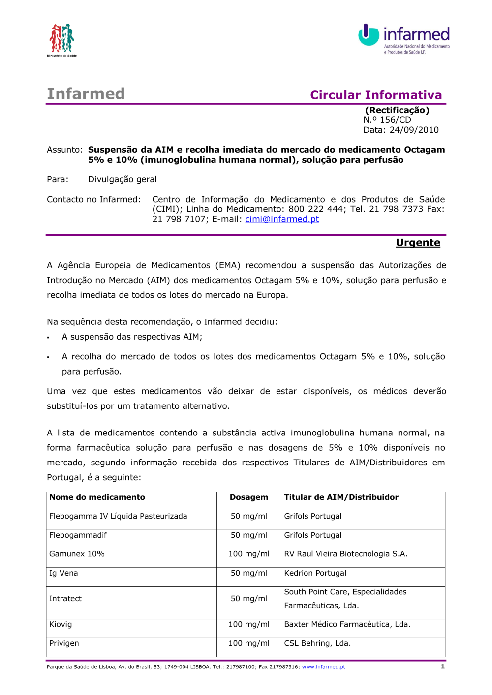 Suspensão da AIM e recolha imediata do mercado do medicamento Octagam 5% e 10% (imunoglobulina humana normal), solução para perfusão