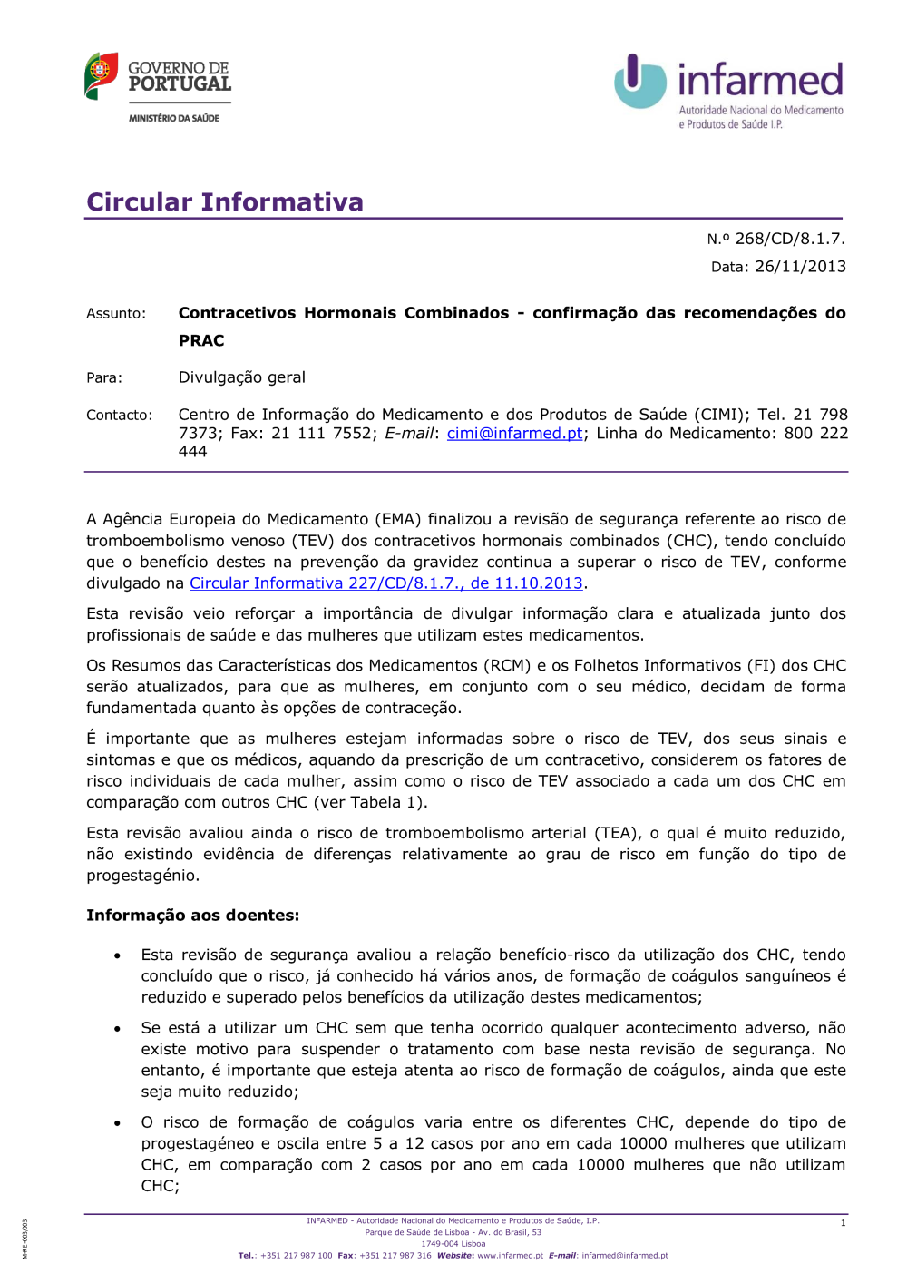 Contracetivos Hormonais Combinados - confirmação das recomendações do PRAC