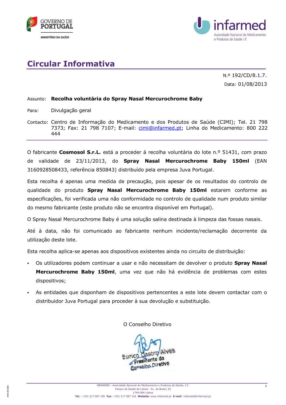 Uploads feitos por Javier Sanchez Doncel, 06-08-2013 16:24 Categorias: Circulares Público: Cidadãos Entidades Profissionais de saúde Taxonomias: Alertas de segurança