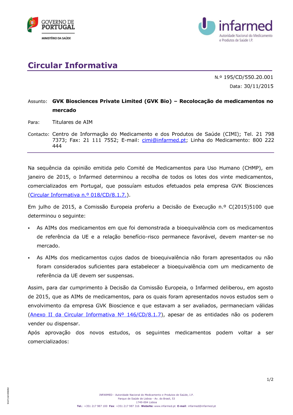 Circular Informativa N.º 195/CD/550.20.001 Data:30/11/2015