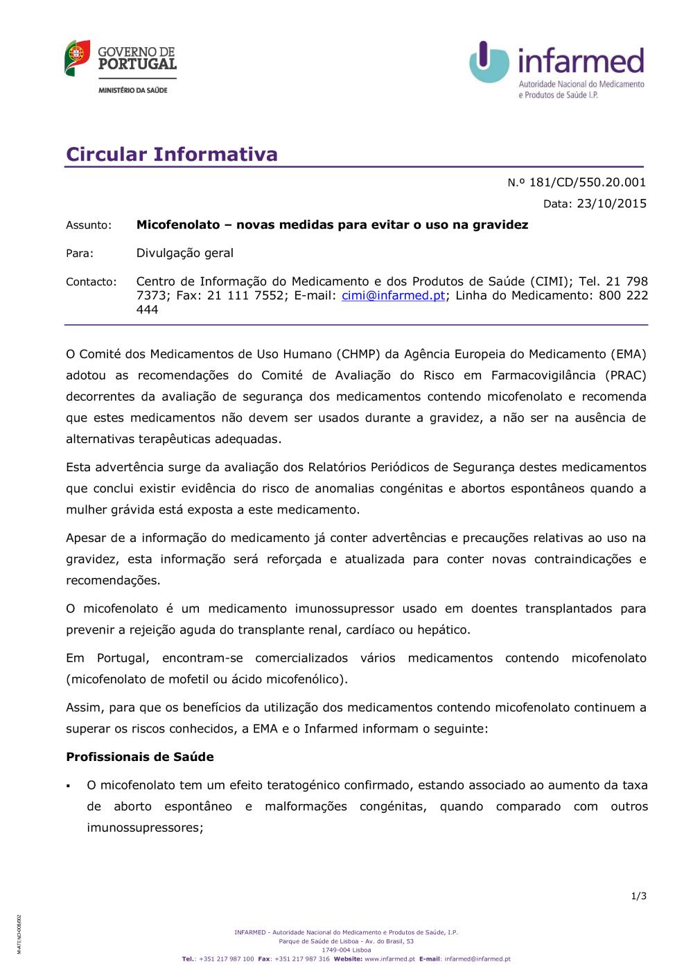 Uploads feitos por Javier Sanchez Doncel, 23-10-2015 18:34 Categorias: Circulares Público: Cidadãos Entidades Profissionais de saúde Taxonomias: Medicamentos de uso humano Alertas de segurança