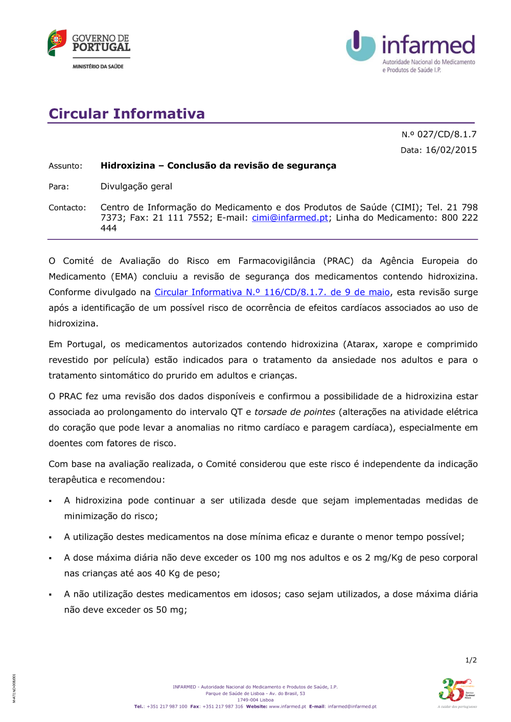Uploads feitos por Javier Sanchez Doncel, 16-02-2015 16:53 Categorias: Circulares Público: Cidadãos Entidades Profissionais de saúde Taxonomias: Medicamentos de uso humano Farmacovigilância Alertas de segurança