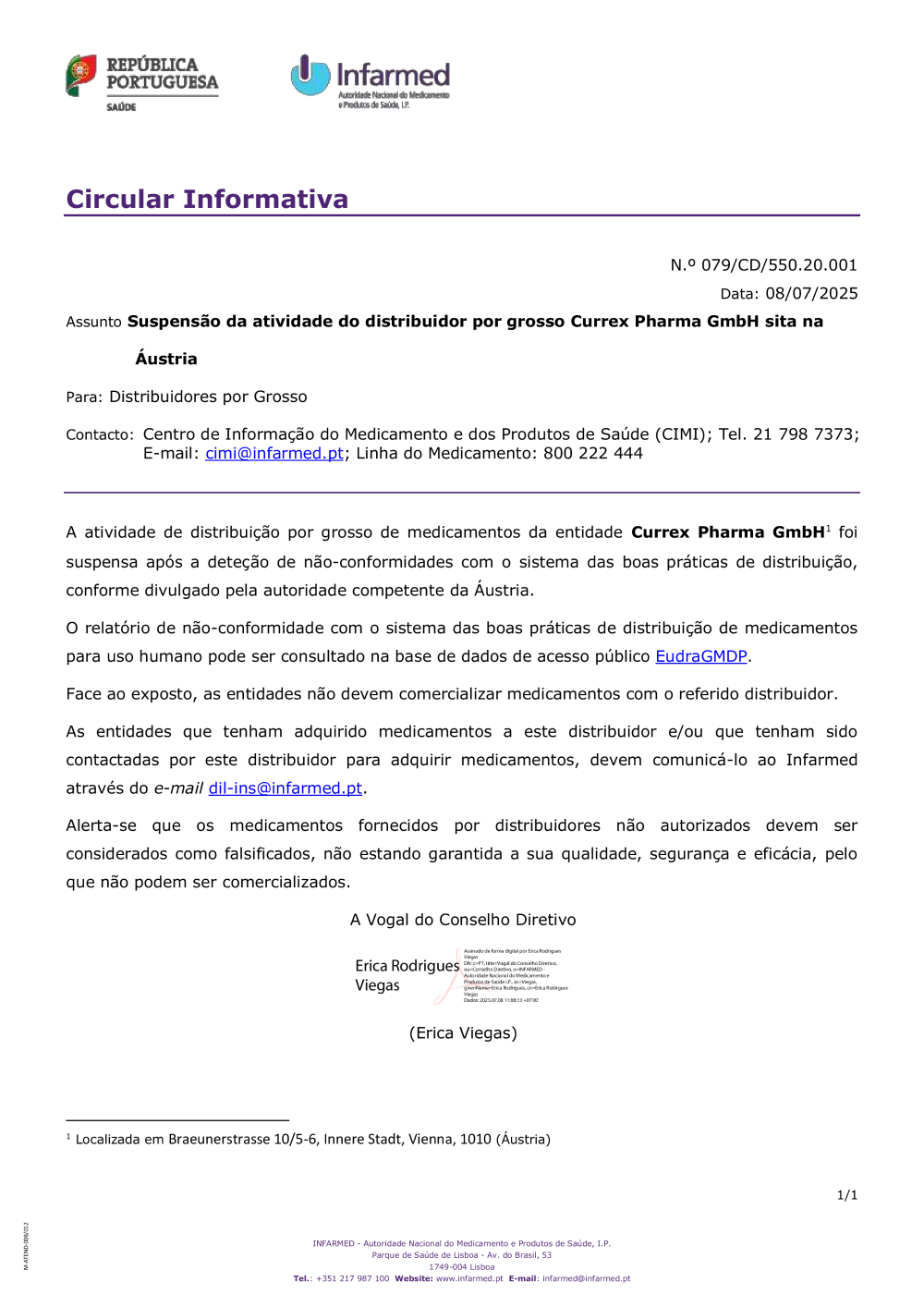 Suspensão da atividade do distribuidor por grosso Currex Pharma GmbH sita na Áustria