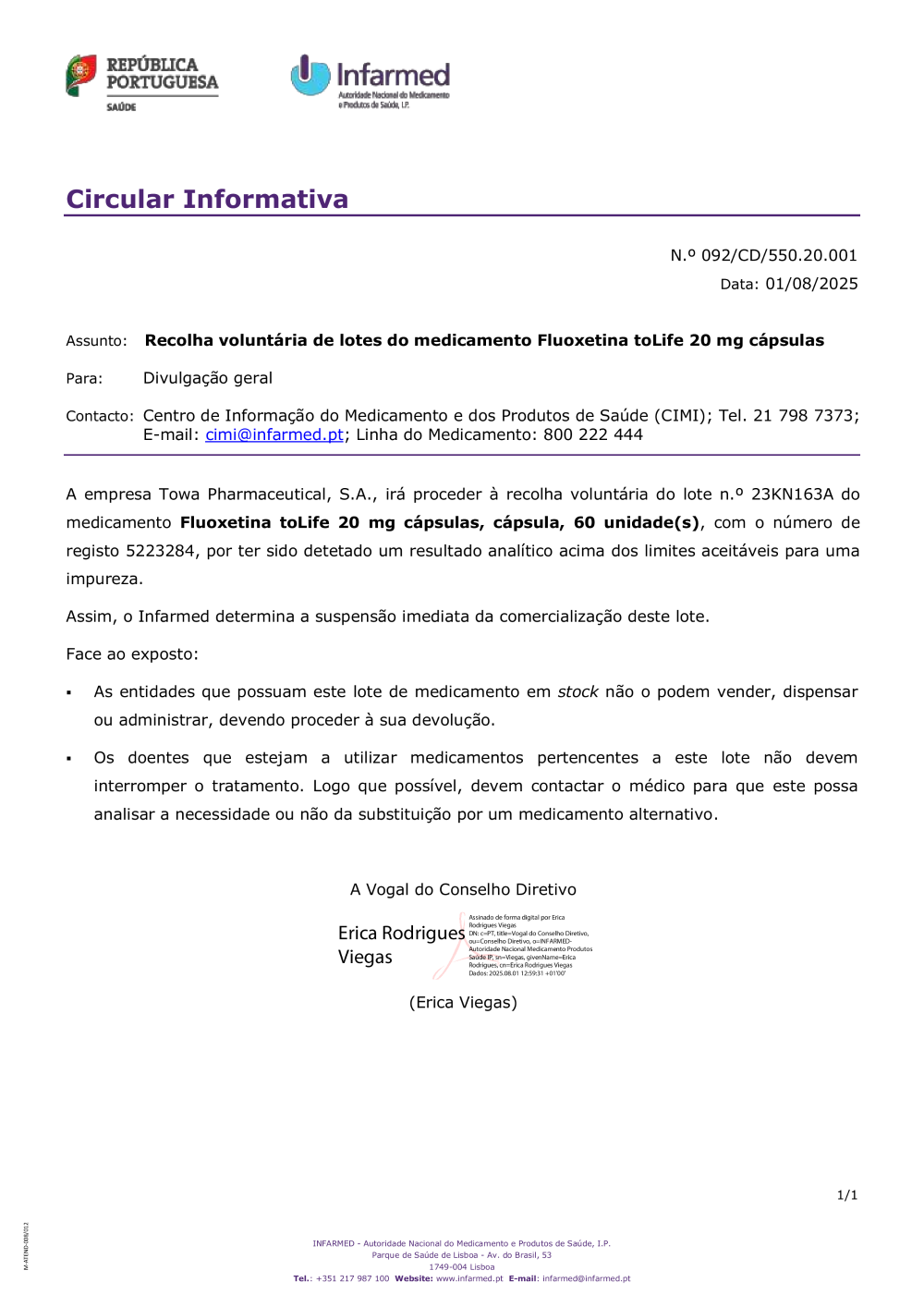 Recolha voluntária de lotes do medicamento Fluoxetina toLife, 20 mg, cápsulas