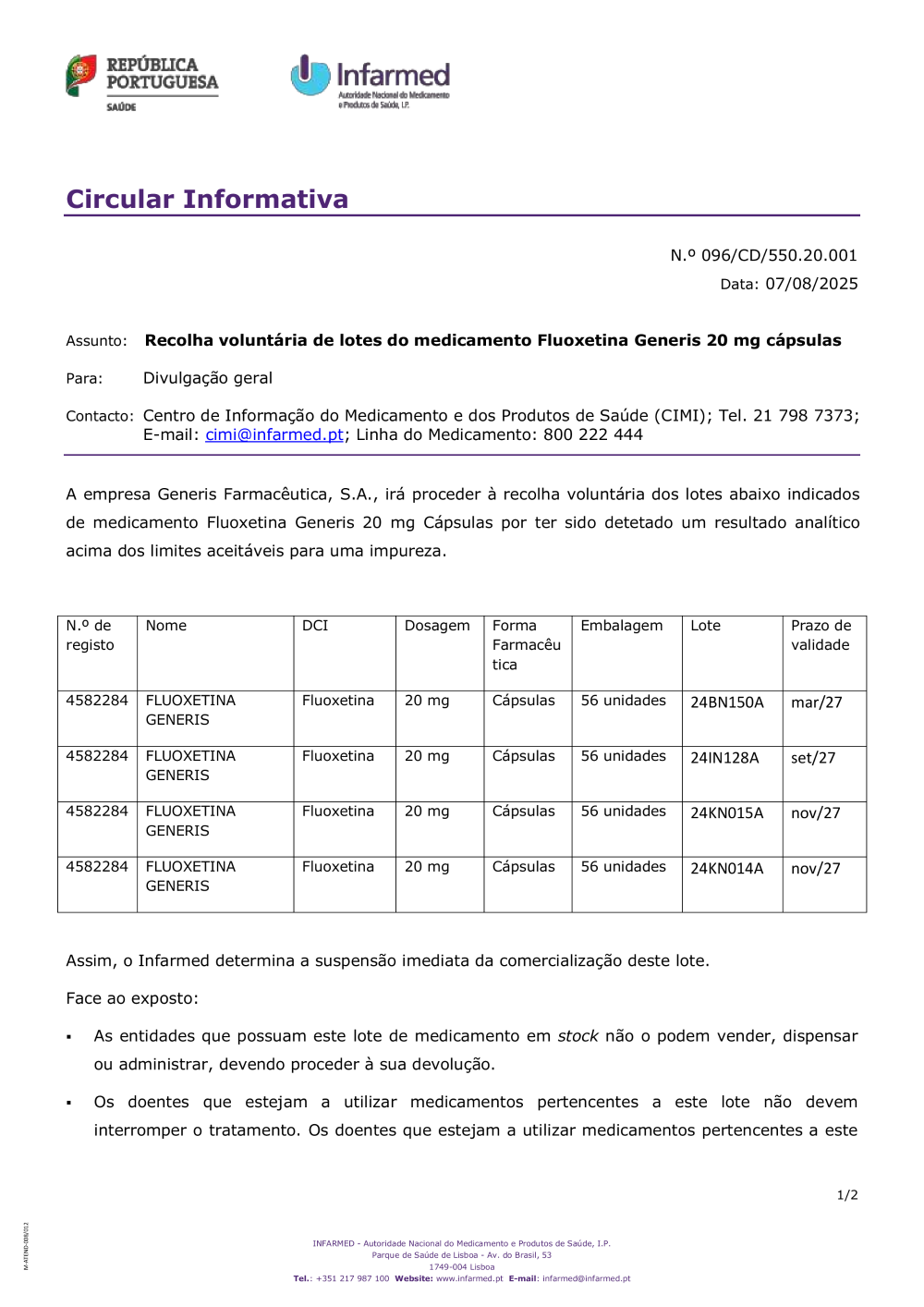 Recolha voluntária de lotes do medicamento Fluoxetina Generis 20 mg, cápsulas