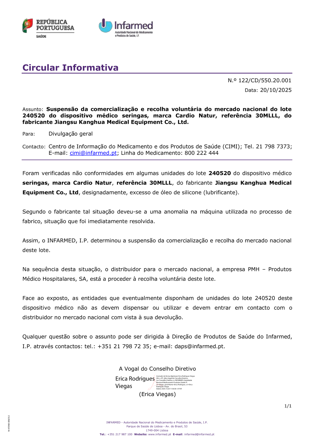 Suspensão da comercialização e recolha voluntária do mercado nacional do lote 240520 do dispositivo médico seringas, marca Cardio Natur, do fabricante Jiangsu Kanghua Medical Equipment Co, Ltd