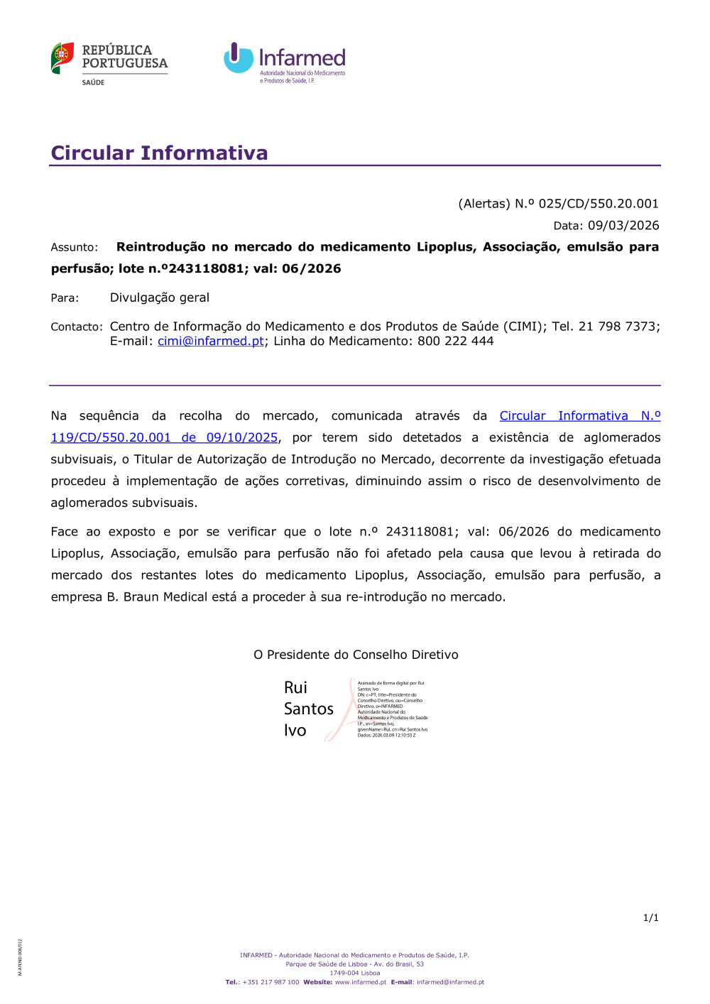Circular Informativa n.º 025/CD/550.20.001 de 09/03/2026