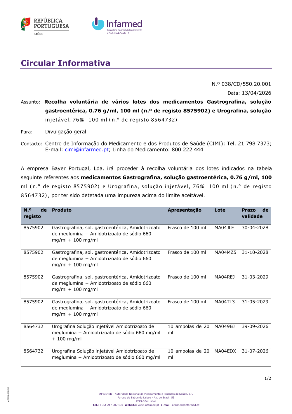 Recolha voluntária de vários lotes dos medicamentos Gastrografina, solução gastroentérica, 0.76 g ml, 100 ml (n.º de registo 8575902) e Urografina, solução injetável, 76% 100 ml (n.º de registo 8564732)