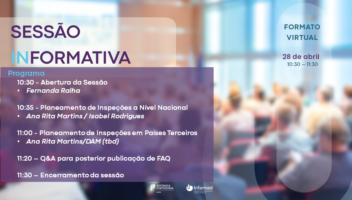 O Infarmed organiza uma Sessão Informativa, subordinada ao tema “Planeamento de Inspeções – INFARMED, I.P.”, no dia 28 de abril de 2026, das 10:30 as 11:30, segundo o programa em anexo.