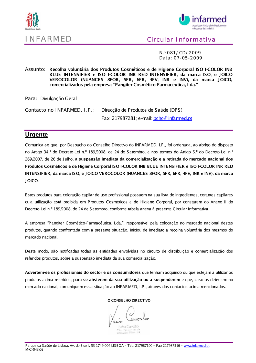 Recolha voluntária dos Produtos Cosméticos e de Higiene Corporal da marca ISO(BLUE INTENSIFIER - RED INTENSIFIER) e da marca JOICO (VEROCOLOR), comercializados pela empresa "Pangiter Cosmético-Farmacêutica, Lda."