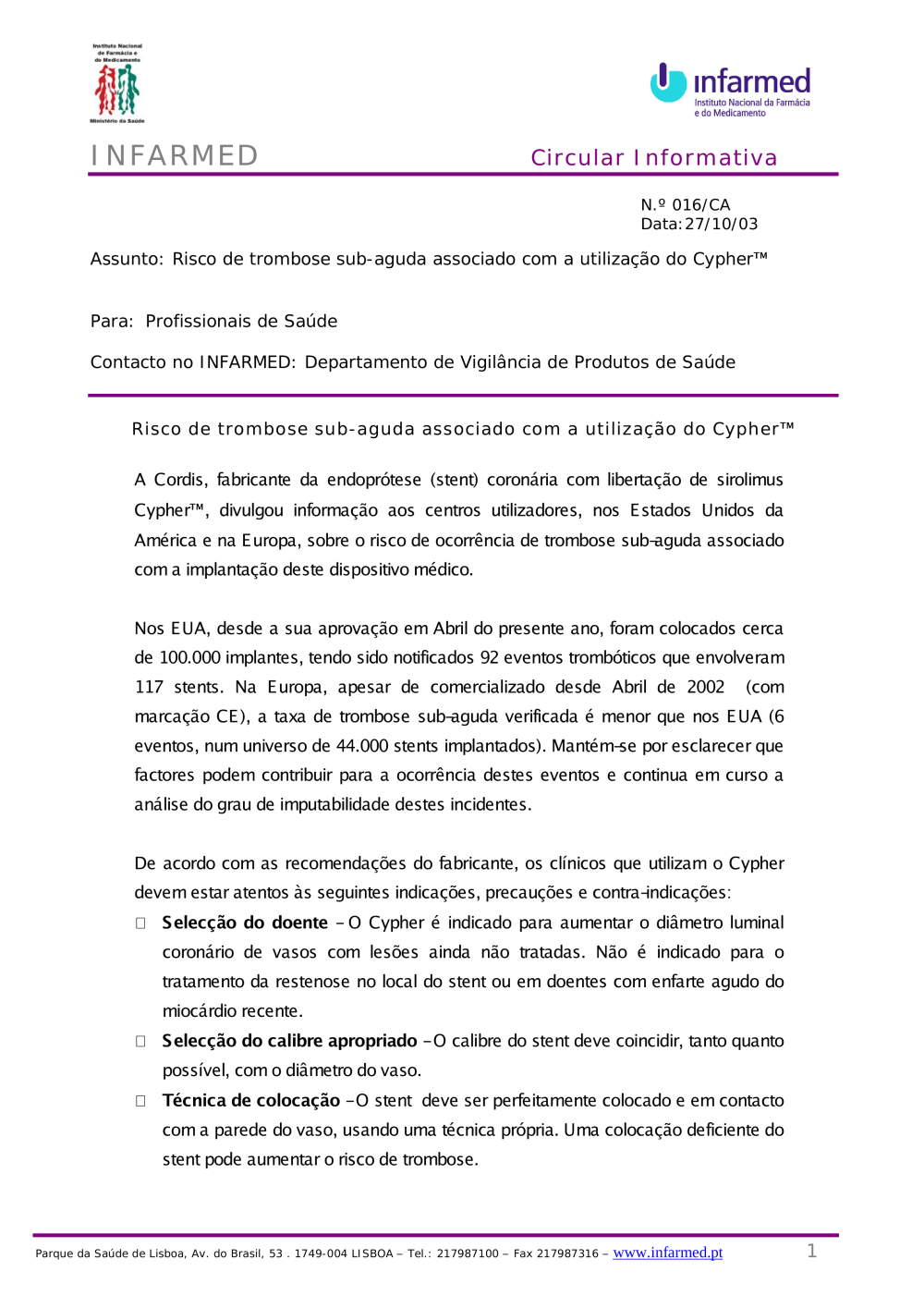 Uploads feitos por Javier Sanchez Doncel, 27-10-2003 17:05 Categorias: Circulares Público: Cidadãos Entidades Profissionais de saúde Taxonomias: Alertas de segurança