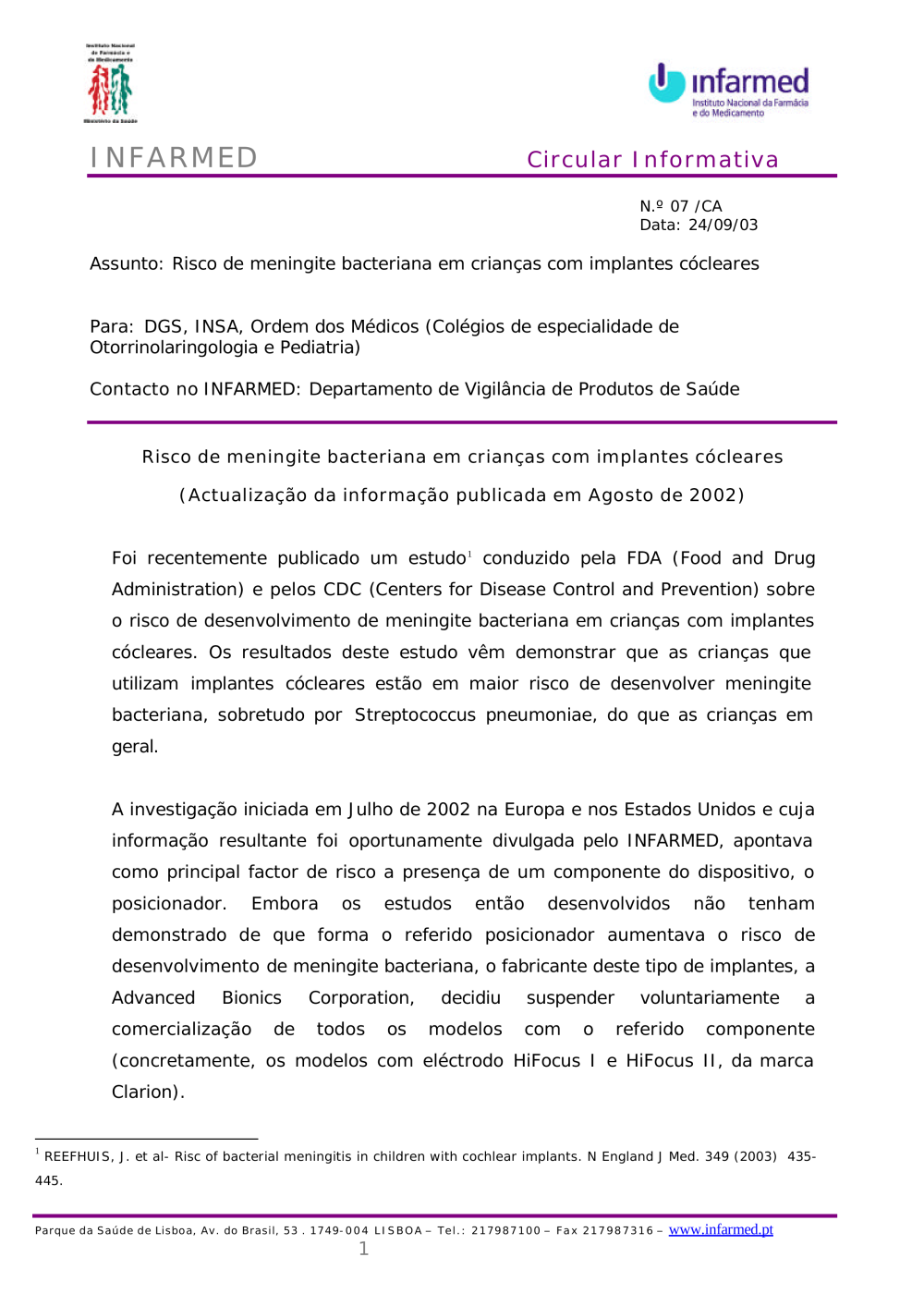 Uploads feitos por Javier Sanchez Doncel, 24-09-2003 18:09 Categorias: Circulares Público: Cidadãos Entidades Profissionais de saúde Taxonomias: Alertas de segurança
