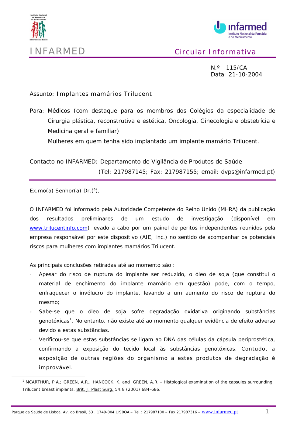 Uploads feitos por Javier Sanchez Doncel, 22-10-2004 16:19 Categorias: Circulares Público: Cidadãos Entidades Profissionais de saúde Taxonomias: Alertas de segurança