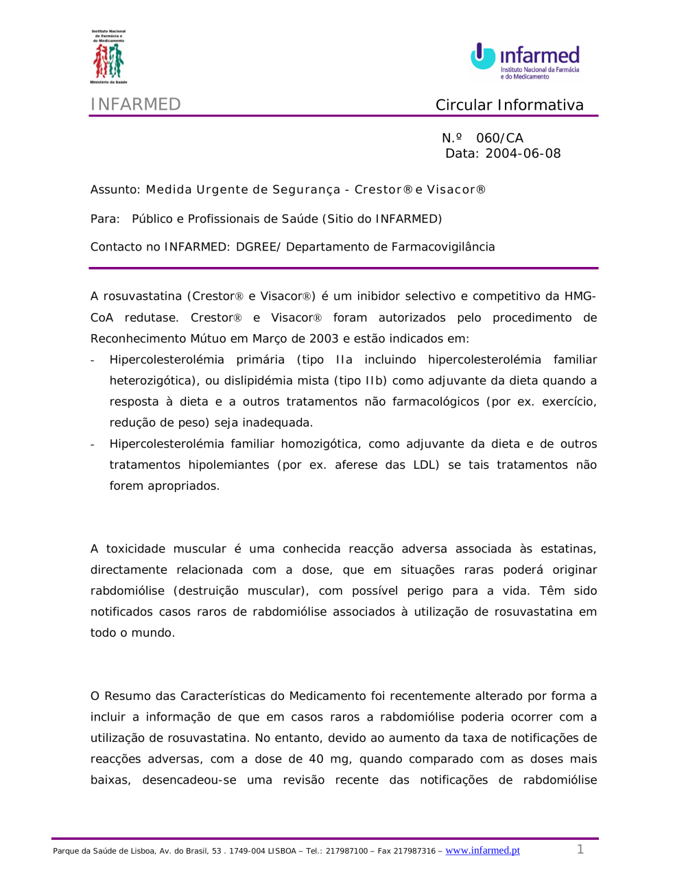 Medida Urgente de Segurança - Crestor® e Visacor®