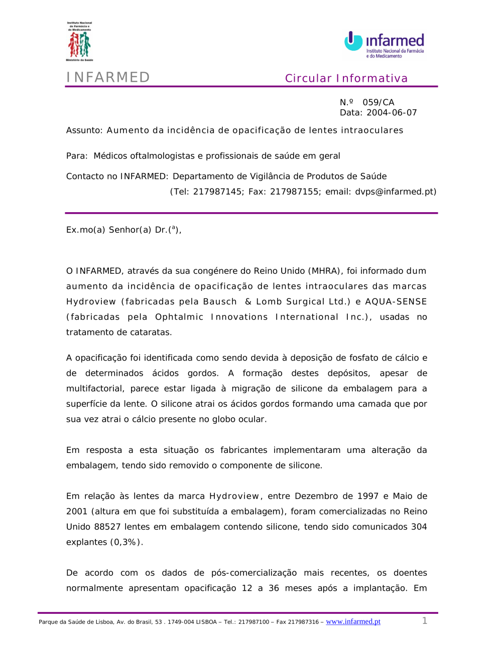 Uploads feitos por Javier Sanchez Doncel, 08-06-2004 17:05 Categorias: Circulares Público: Cidadãos Entidades Profissionais de saúde Taxonomias: Alertas de segurança