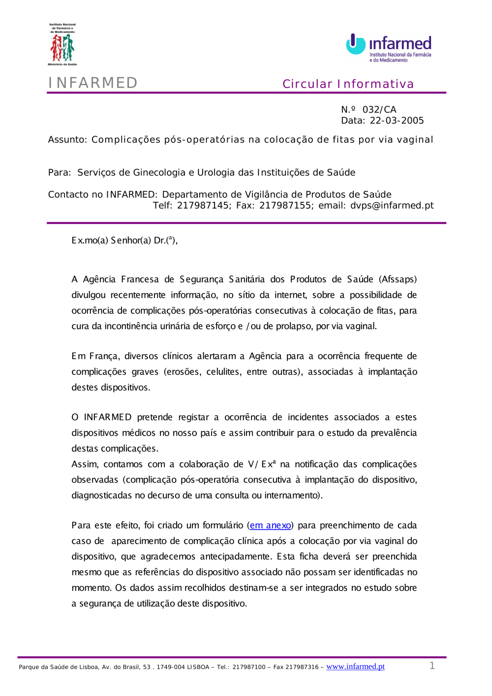 Circular Informativa N.º 032/CA Data: 22-03-2005