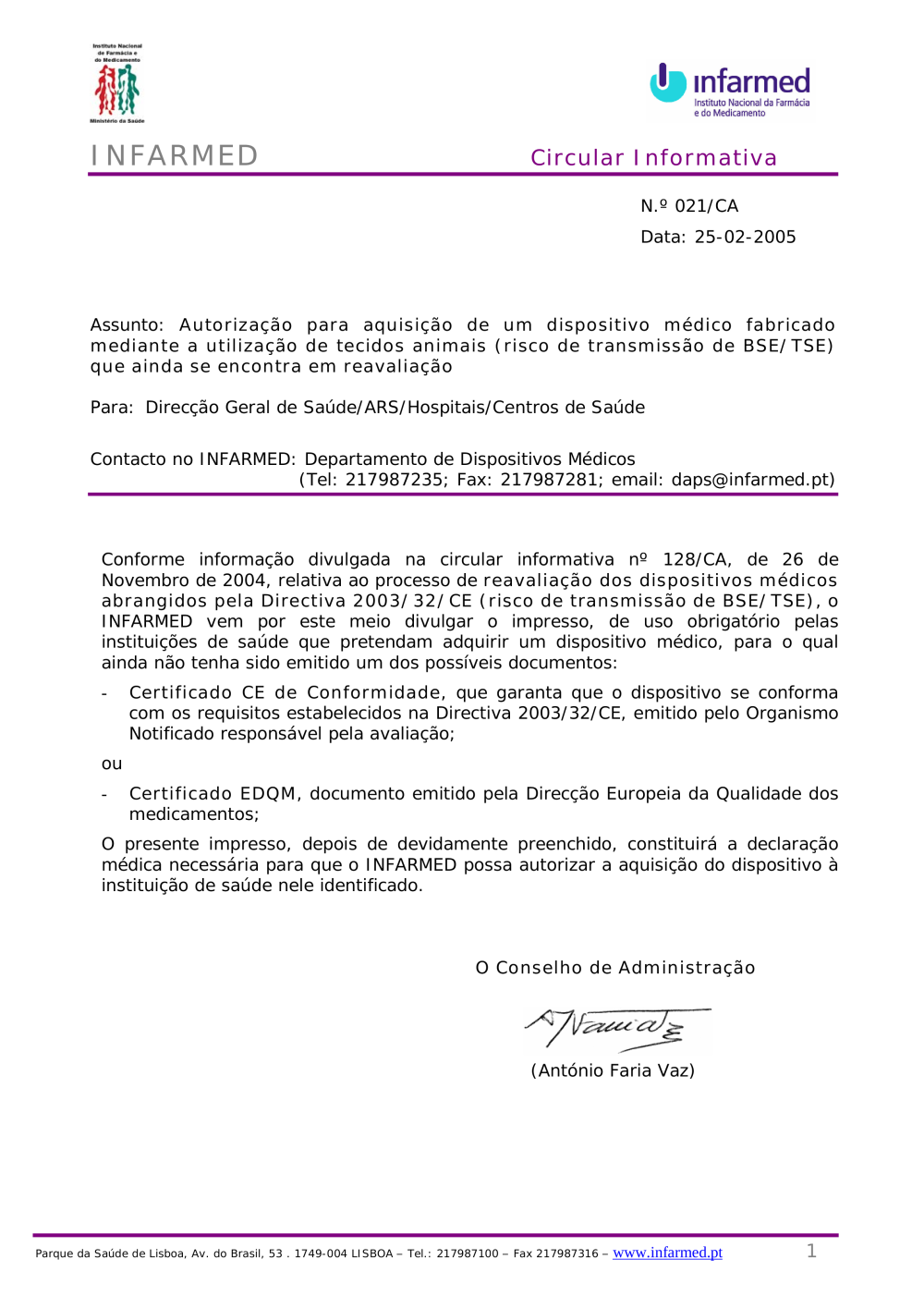Circular Informativa N.º 021/CA Data: 25-02-2005