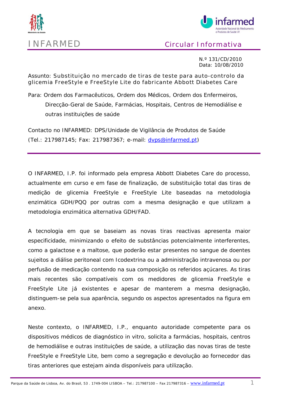 Uploads feitos por Javier Sanchez Doncel, 10-08-2010 13:40 Categorias: Circulares Público: Cidadãos Entidades Profissionais de saúde Taxonomias: Alertas de segurança