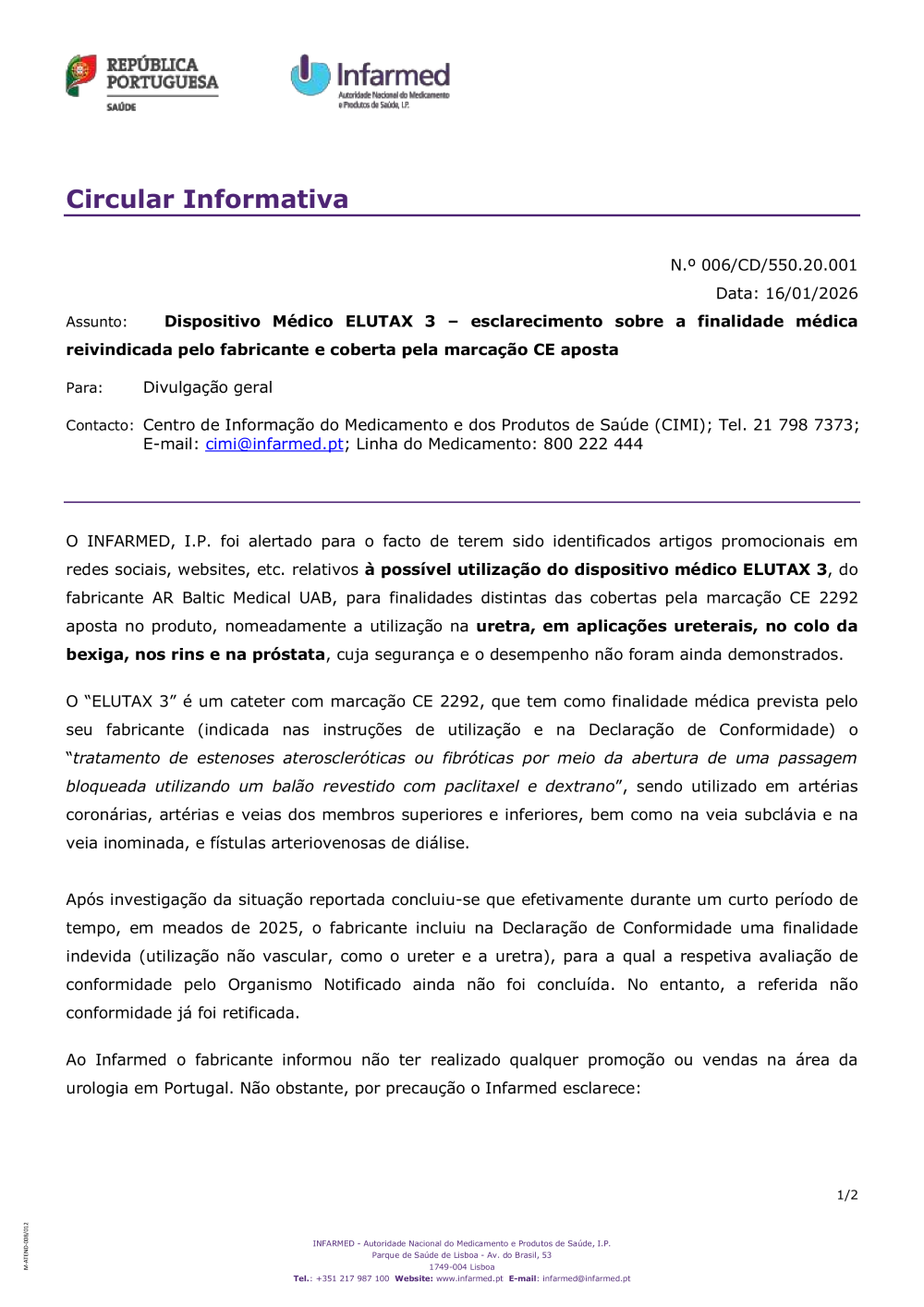 Circular Informativa - N.º 006/CD/550.20.001 de 16/01/2026