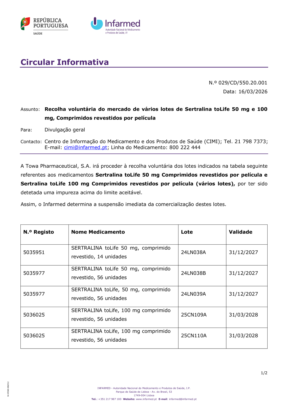 Recolha voluntária do mercado de vários lotes de Sertralina toLife 50 mg e 100 mg, Comprimidos revestidos por película