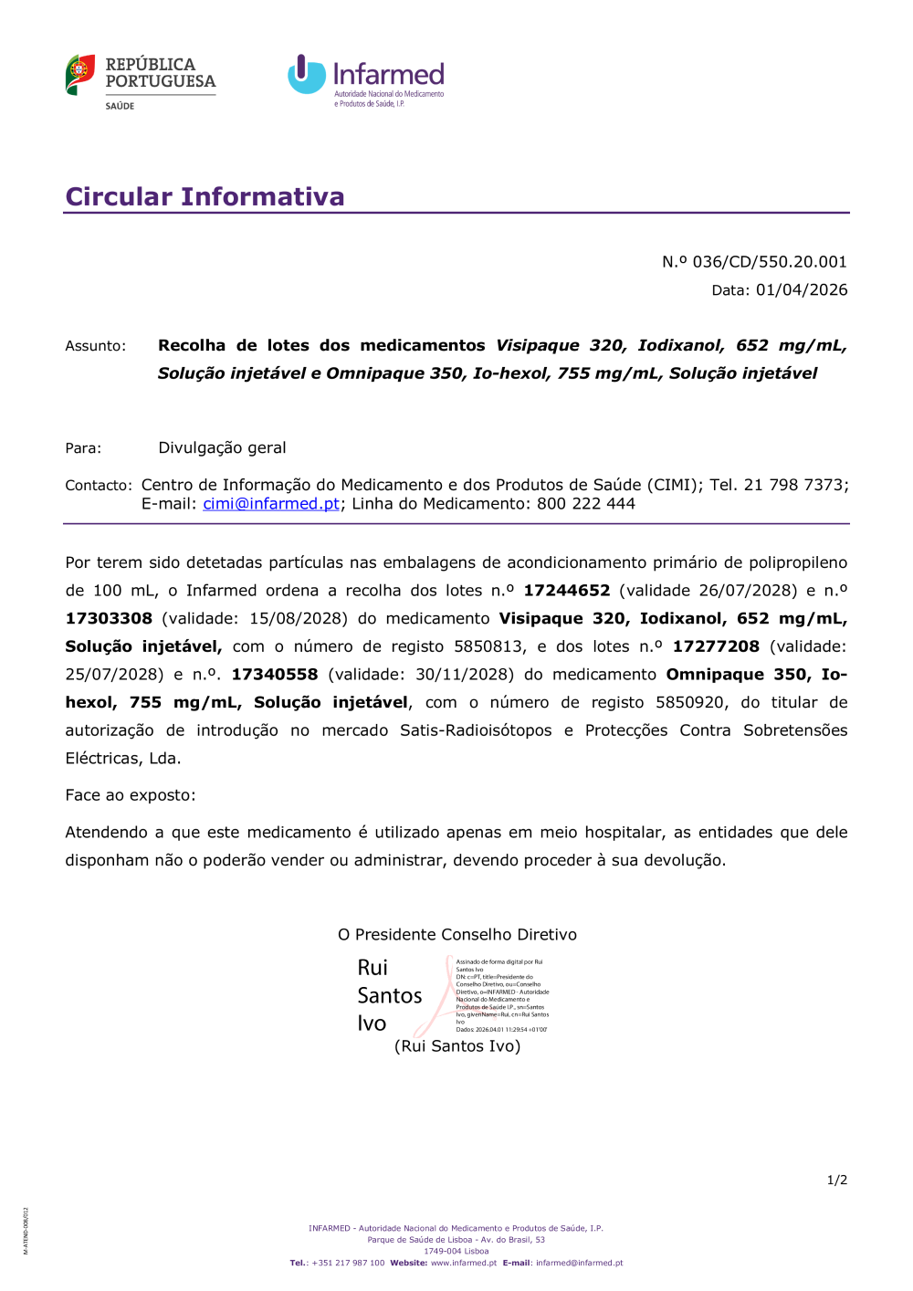 Uploads feitos por carla machado, 02-04-2026 11:46 Categorias: Circulares Público: Entidades Profissionais de saúde Taxonomias: Alertas de qualidade Medicamentos de uso humano Inspeção