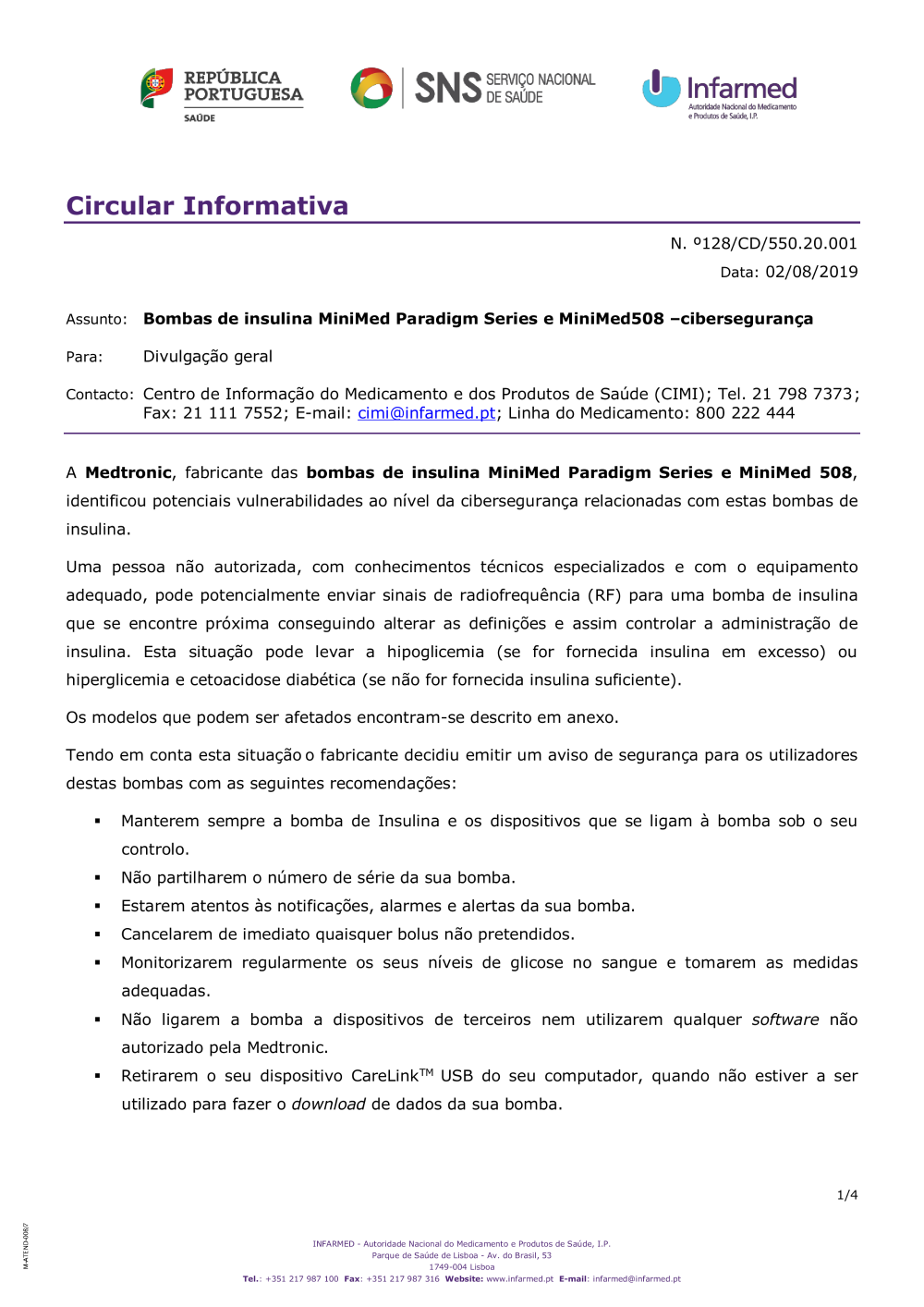 Bombas de insulina MiniMed Paradigm Series e MiniMed508 - cibersegurança (Versão 1.0)