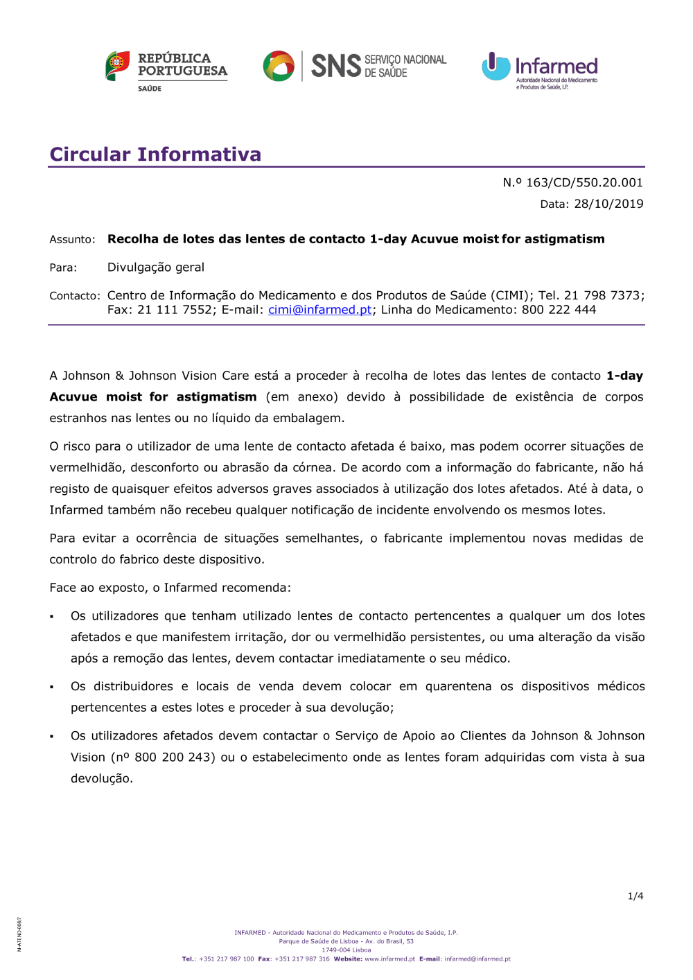 Recolha de lotes das lentes de contacto 1-day Acuvue moist for astigmatism (Versão 1.0)