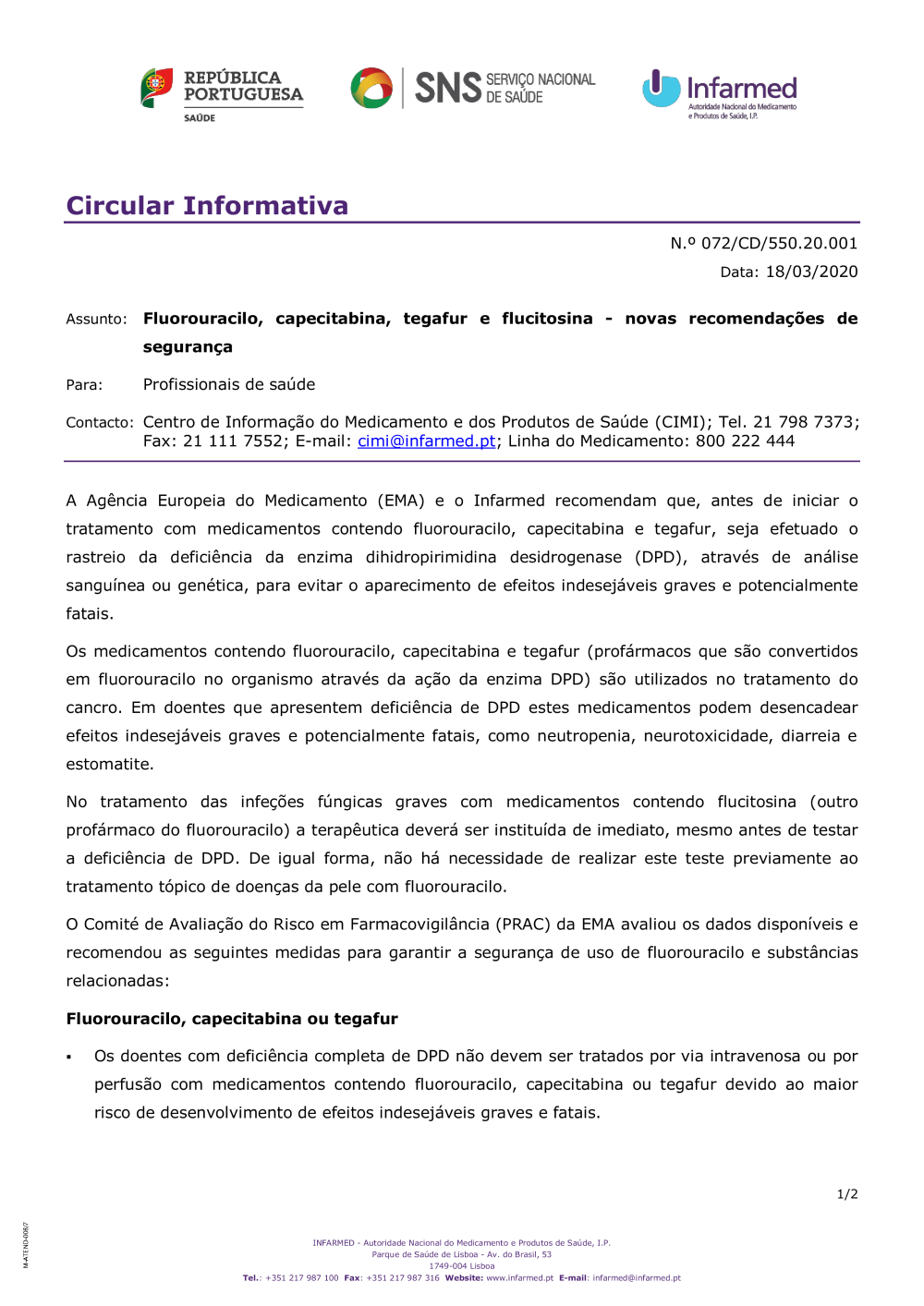 Fluorouracilo, capecitabina, tegafur e flucitosina - novas recomendações de segurança (Versão 1.0)