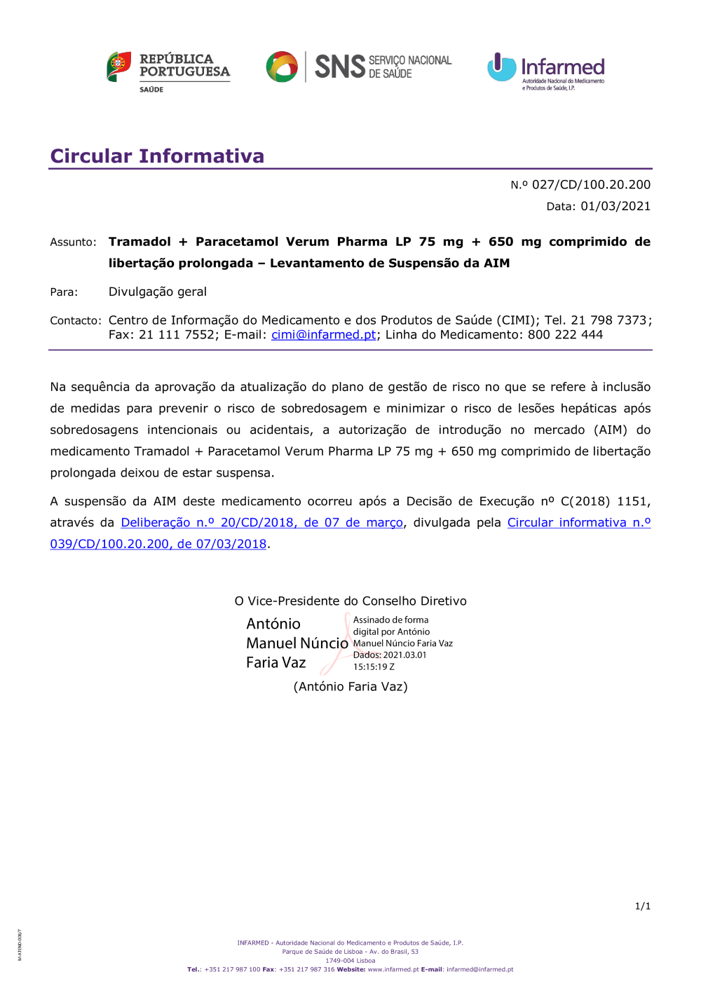 Tramadol + Paracetamol Verum Pharma LP 75 mg + 650 mg comprimido de libertação prolongada ¿ Levantamento de Suspensão da AIM (Versão 1.0)