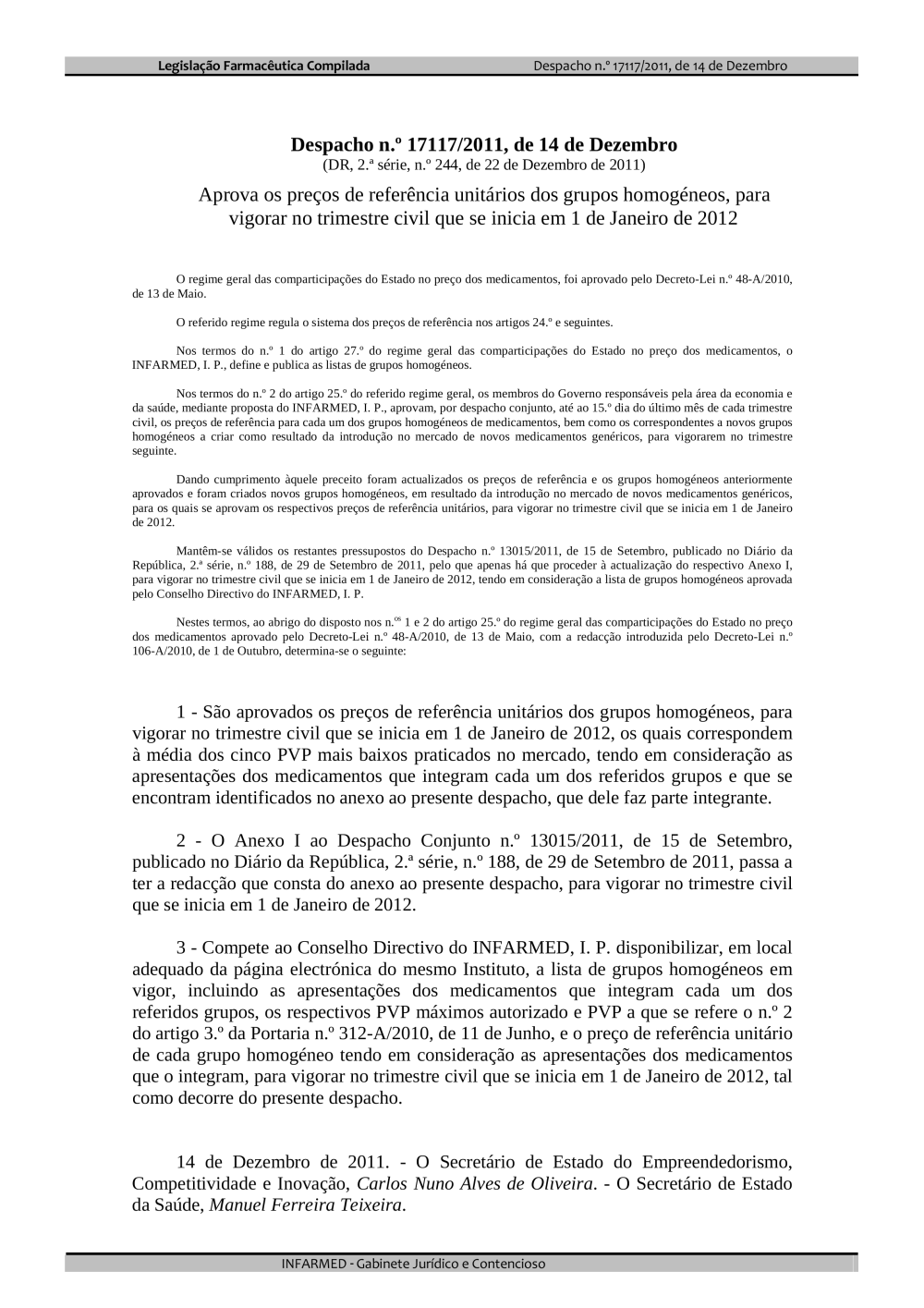 Aprova os preços de referência unitários dos grupos homogéneos, para vigorar no trimestre civil que se inicia em 1 de Janeiro de 2012