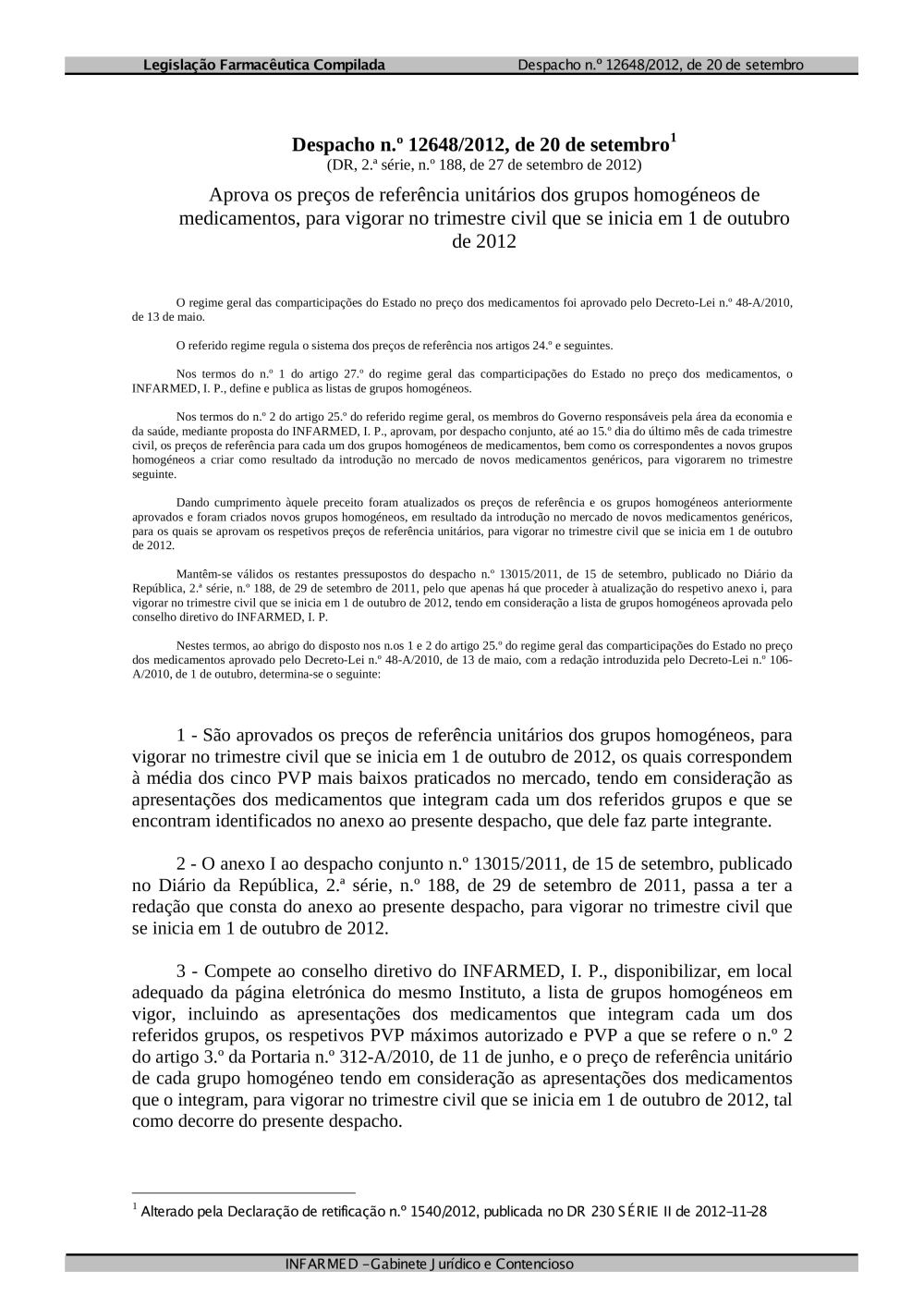 Aprova os preços de referência unitários dos grupos homogéneos de medicamentos, para vigorar no trimestre civil que se inicia em 1 de outubro de 2012
