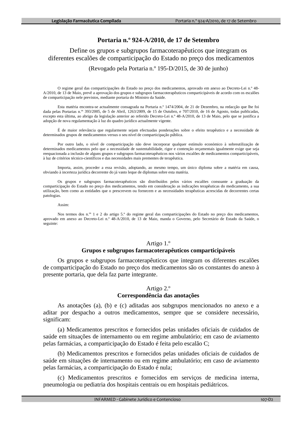 Define os grupos e subgrupos farmacoterapêuticos que integram os diferentes escalões de comparticipação do Estado no preço dos medicamentos. (Revogado pela Portaria n.º 195-D/2015, de 30 de junho)