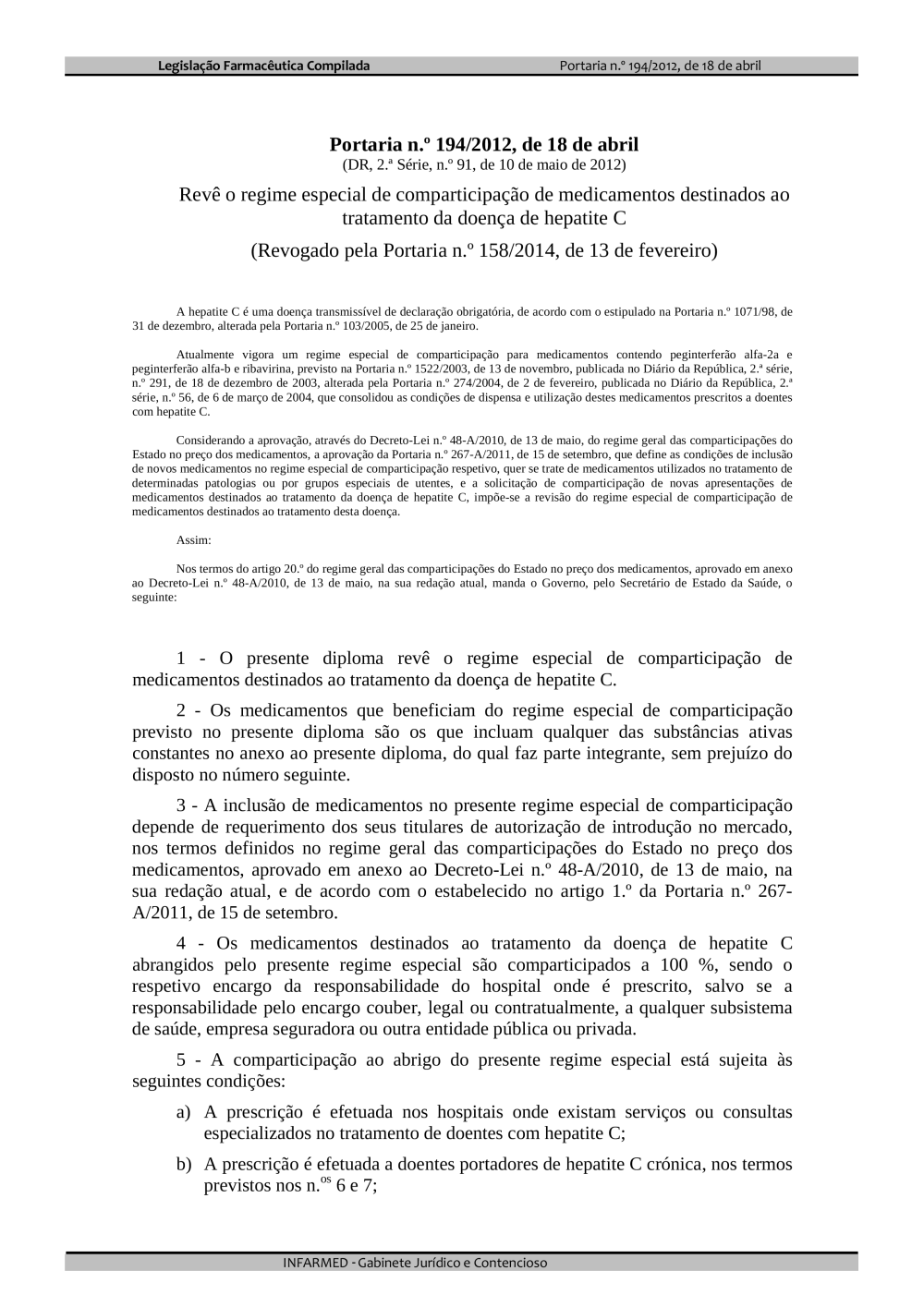Revê o regime especial de comparticipação de medicamentos destinados ao tratamento da doença de hepatite C (Revogado pela Portaria n.º 158/2014, de 13 de fevereiro)