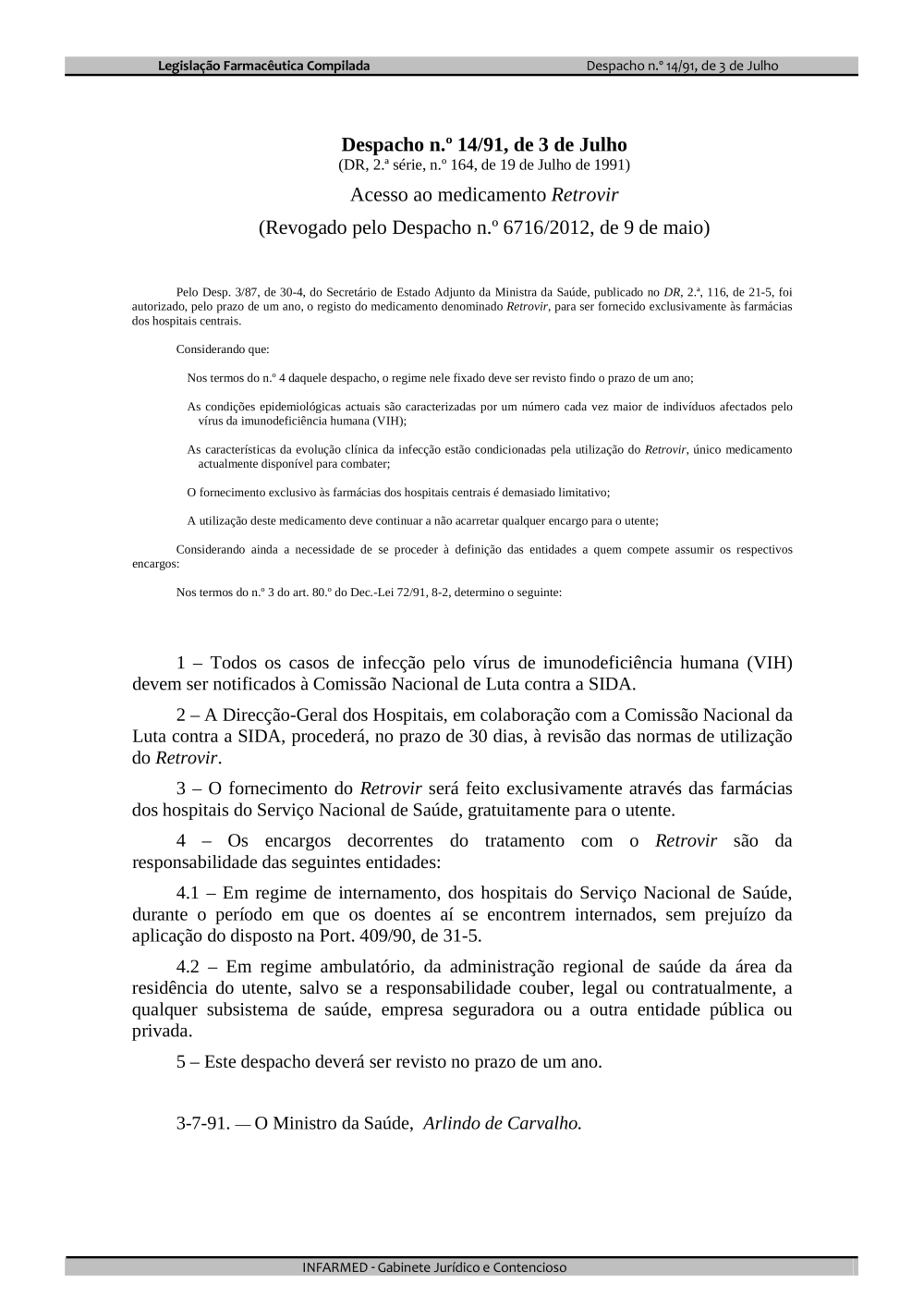 Acesso ao medicamento Retrovir (Revogado pelo Despacho n.º 6716/2012, de 9 de maio)