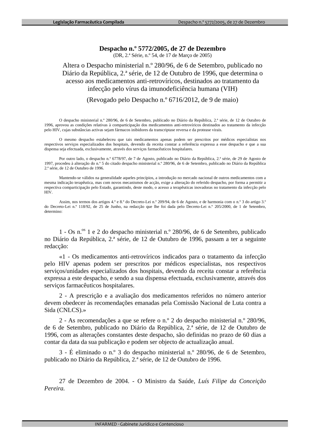 Altera o Despacho ministerial n.º 280/96, de 6 de Setembro, publicado no Diário da República, 2.ª série, de 12 de Outubro de 1996, que determina o acesso aos medicamentos anti-retrovíricos, destinados ao tratamento da infecção pelo vírus da imunodeficiência humana (VIH) (Revogado pelo Despacho n.º 6716/2012, de 9 de maio)