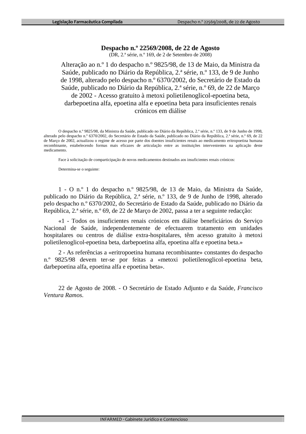 Alteração ao n.º 1 do despacho n.º 9825/98, de 13 de Maio, da Ministra da Saúde, publicado no Diário da República, 2.ª série, n.º 133, de 9 de Junho de 1998, alterado pelo despacho n.º 6370/2002, do Secretário de Estado da Saúde, publicado no Diário da República, 2.ª série, n.º 69, de 22 de Março de 2002 - Acesso gratuito à metoxi polietilenoglicol-epoetina beta, darbepoetina alfa, epoetina alfa e epoetina beta para insuficientes renais crónicos em diálise