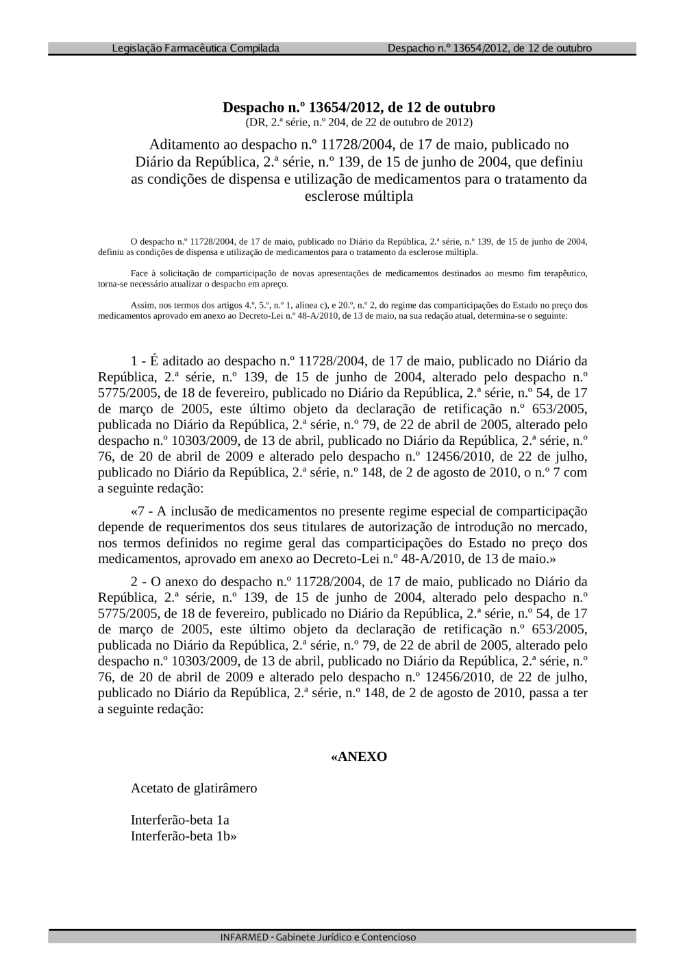 Aditamento ao despacho n.º 11728/2004, de 17 de maio, publicado no Diário da República, 2.ª série, n.º 139, de 15 de junho de 2004, que definiu as condições de dispensa e utilização de medicamentos para o tratamento da esclerose múltipla