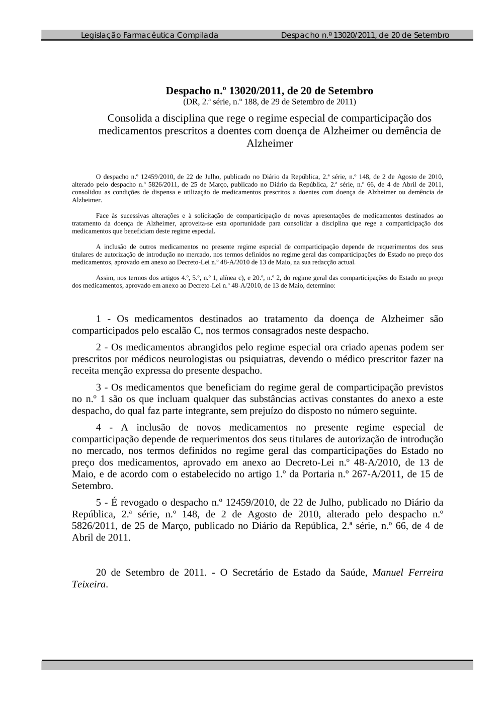 Consolida a disciplina que rege o regime especial de comparticipação dos medicamentos prescritos a doentes com doença de Alzheimer ou demência de Alzheimer