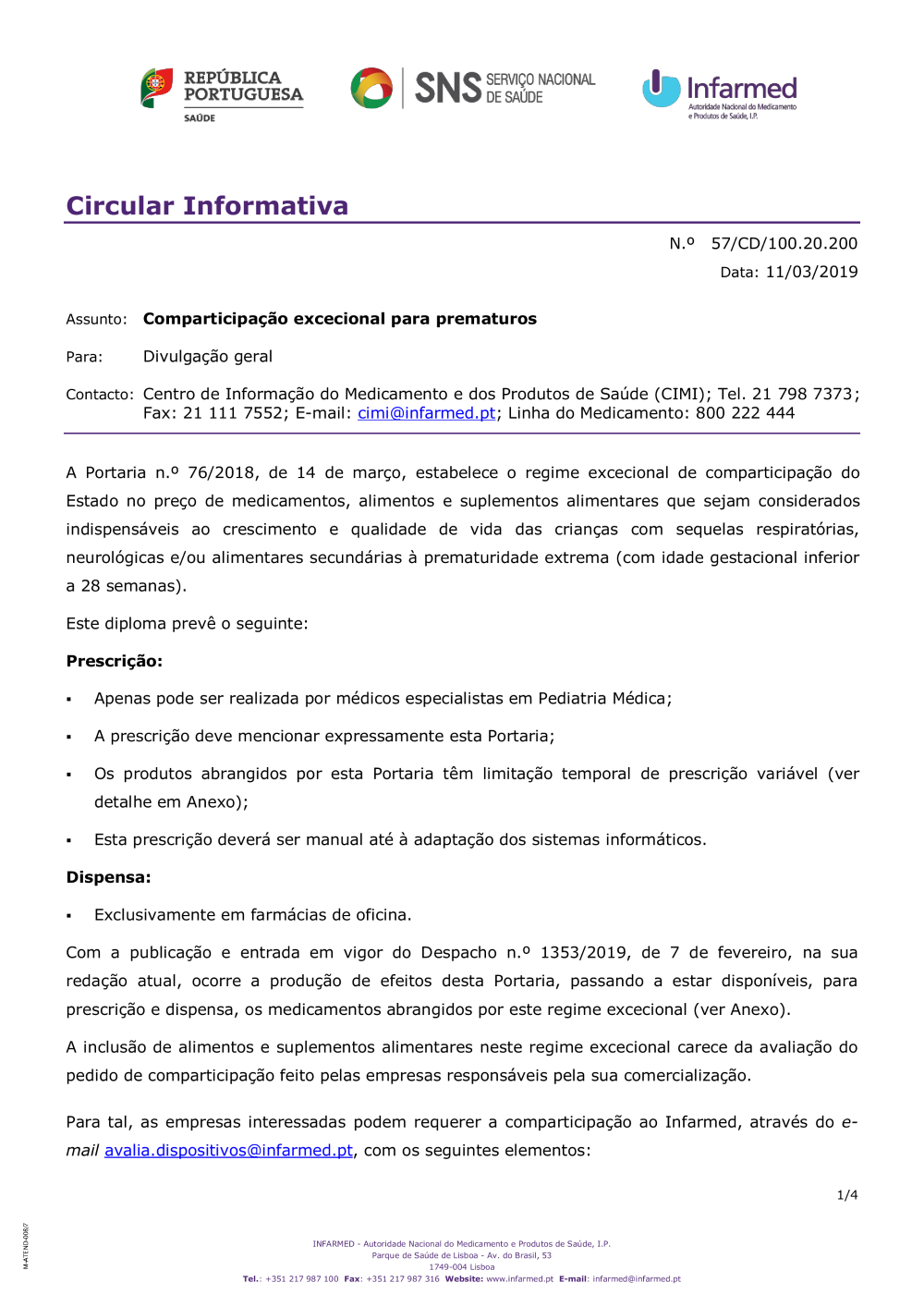 Comparticipação excecional para prematuros Circular Informativa N.º 57CD100.20.200