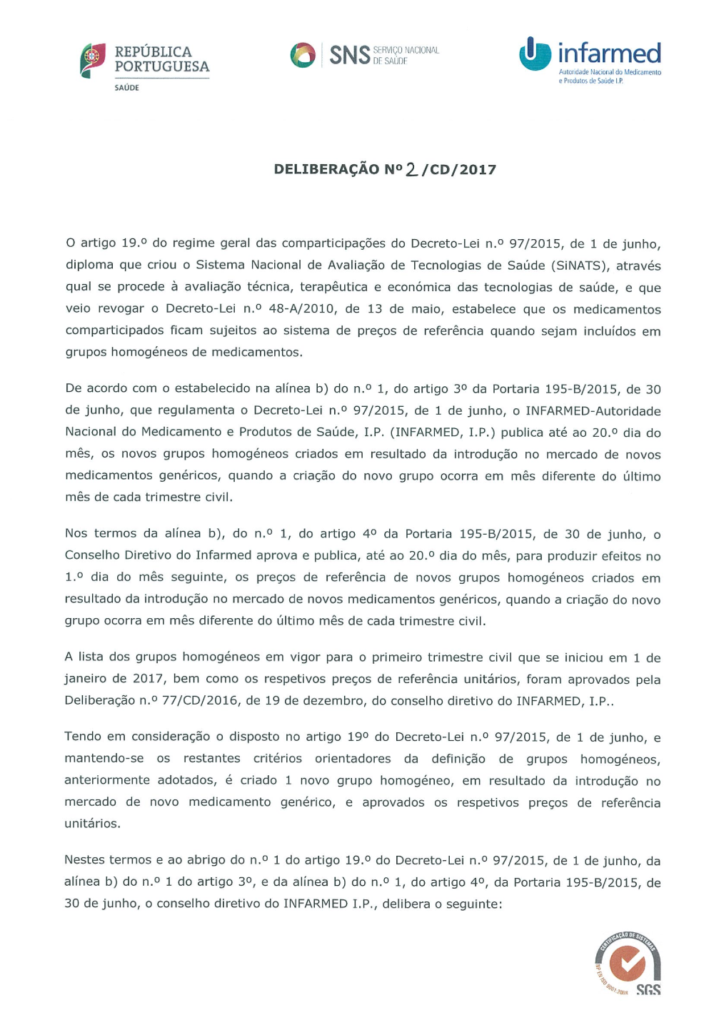 Sistema de Preços de Referência ¿ Aditamento de novos grupos homogéneos