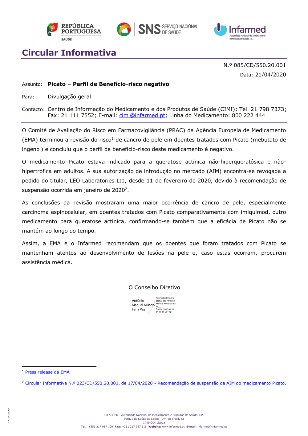 Uploads feitos por sandra queiroz, 21-04-2020 17:32 Categorias: Circulares Público: Cidadãos Entidades Profissionais de saúde Taxonomias: Medicamentos de uso humano Farmacovigilância